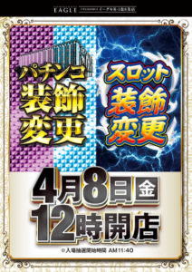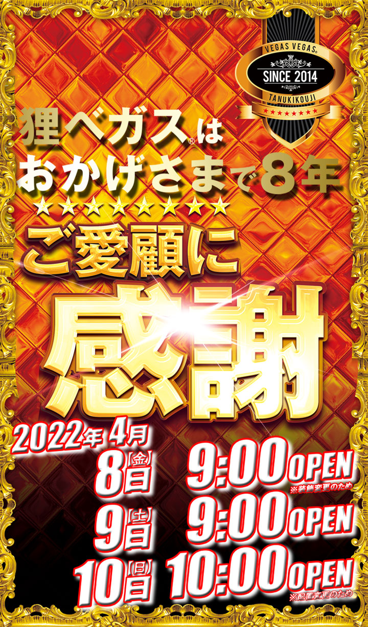 「8」の付く日。まずは、4月8日はベガス狸4丁目の周年。昨年は不発?みたいだったので今年はどうでしょうかね??最近「5」の付く日も結構元気ないので頑張ってほしいところです。