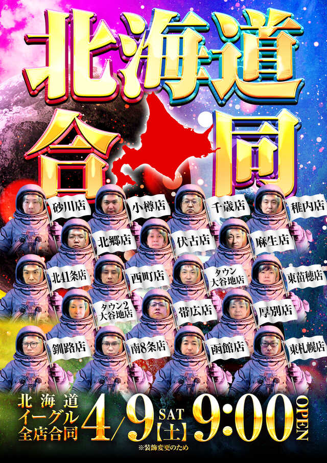 【4/9】DOKO行く?まとめ(2022年宇宙の旅) DOKO行く? 2022.04.08 イーグル HAPPY 南6条×麻生×藻岩 厚別店 厚別通り店 西町店 手稲前田店 ひまわり 駅前タワー店 豊平店 篠路店 清田店 真駒内店 マルハン 苗穂店 手稲店 おわりに 「9」の付く日、土曜日。イーグルはまた何やら意味がわからない感じのポスター出してますね。。。番長ZEROの確定画面を意識したのか…。調べると4月は世界宇宙旅行の日があるので季節ごとに何かのイメージして作っているのか…。 対抗があまりないのでイーグルになりそうなので真偽のほどを確かめてみたいと思います。(抽選番号次第)