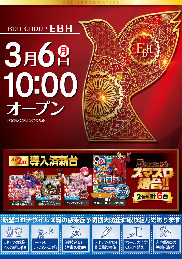 【3/6】DOKO行く?まとめ(平日の狭き門) DOKO行く? 2023.03.05 EBH マルハン 苗穂店 イーグル 麻生店 ベガスベガス 発寒店 おわりに 「6」のつく日。EBHの特定日。他のお店は平日月曜日から特に何か仕掛けがあるわけでもなくEBHの狭き門を通れるかどうかになりそうです……。 他のお店の機種示唆は正直朝からじゃなくても間に合う気がしますね。