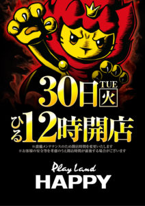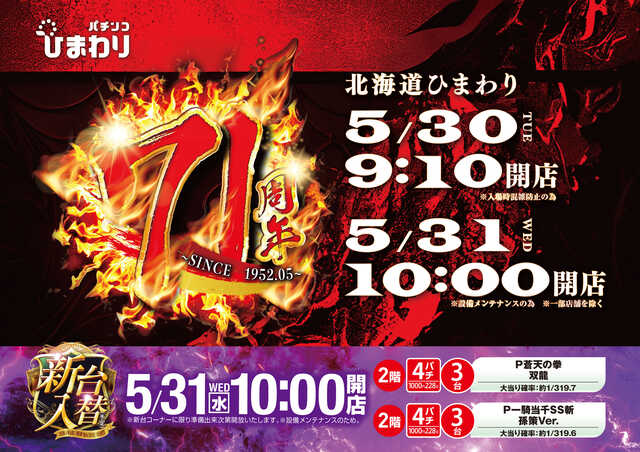 【5/30】DOKO行く?まとめ(71周年最後の「0」) DOKO行く? 2023.05.29 ひまわり HAPPY 手稲前田店 西宮の沢店 屯田四条店 マルハン 苗穂店 美しが丘店 イーグル 麻生店 ゴールドラッシュ ライジング 元町店 おわりに 「0」の付く日。ひまわりの特定日。「0」の日はポスター出していないお店も多いひまわりですが、71周年ということもあり、今月は一貫してポスター出ていましたね!! 明日で71周年もラストなので対抗も正直ない状況なのでひまわりで決まりですかね……!!