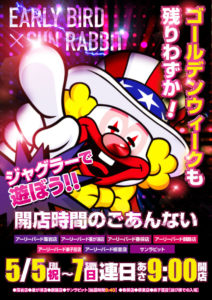 5月5日は、ベガスベガスの年イチ。今年はスマスロもバリバリあるので北海道ではまだまだ扱いが厳しめな北斗をはじめ万枚製造機たちも活躍してくれるでしょうか……??毎年楽しみにしていますが、GW期間ということもあり結構肩透かしになるお店も多いのでお店選びは慎重に……(去年痛い目見た…)