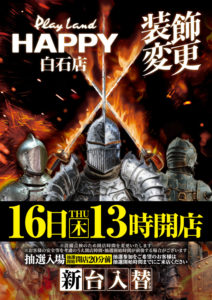 【11/16】DOKO行く?まとめ(HAPPYの周年は鉄板⁉) DOKO行く? 2023.11.15 HAPPY白石店(周年) EBH M’s666 マルハン 琴似店 ひまわり 豊平店 イーグル 麻生店 おわりに 「6」のつく日。EBH&M’s666の特定日。昨日の豊平ひまわりに続きHAPPY白石の周年です! 最近巷を騒がせているHAPPY3騎士のポスターも同時に出ているので明日は祭り確定ではないでしょうか・・・・・・!?
