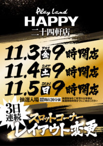 【11/4】DOKO行く?まとめ(なまらが来る……) DOKO行く? 2023.11.03 マルハン 琴似店(なまらいぶ) 苗穂店 美しが丘店(双龍) イーグル 東札幌店 麻生店 HAPPY 二十四軒店 西宮の沢店 厚別店 BDH おわりに 「4」のつく日、特定日なしの土曜日。昨日の祝日があまり強いポスターがなかったので土日も心配でしたが、マルハン琴似がなまらいぶということで設定狙いできるお店があるというだけで嬉しいですね……。さすがに明日は琴似マルハン1強か……。