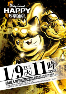 【1/9】DOKO行く?まとめ(オドロキハジマル?) DOKO行く? 2024.01.08 イーグル HAPPY 南6条店、手稲前田店、栄町店、厚別通り店 麻生店 藻岩店 ひまわり 豊平店 ベガスベガス 狸小路店 おわりに 「9」の付く日。イーグル1発目の特定日。お正月ムードも終えついに本格的に平常営業が戻ってきそうです。 対抗のHAPPYも「ゴールドHAPPY君」でバチバチの対抗ムードで明日は期待できそうです。