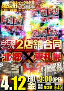 【4/12】DOKO行く?まとめ(さみしい金曜日) DOKO行く? 2024.04.11 イーグル 東札幌×北郷 麻生店 マルハン 苗穂店 おわりに 「2」の付く日。がちゃぽんの特定日。週末ですが、ちょっと寂しい感じですね。特日以外だとイーグル東札幌&北郷が3台並び??くらいしか狙い目がなさそう……。