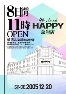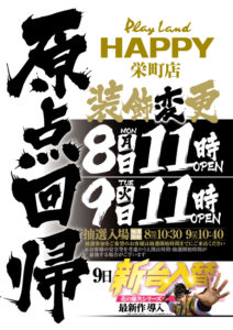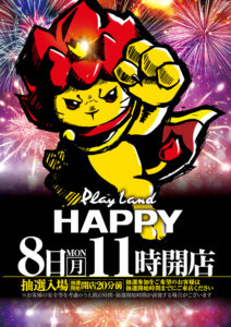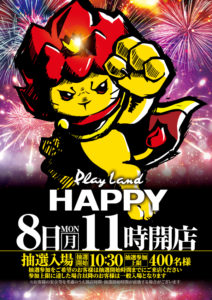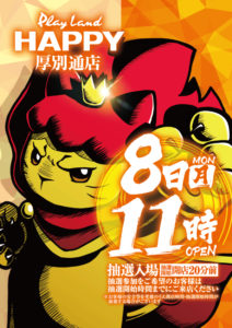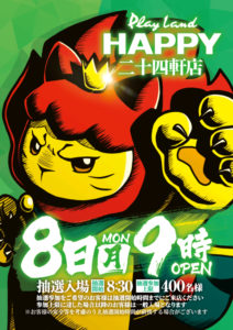 【7/8】DOKO行く?まとめ(期待の新ポスター!?) DOKO行く? 2024.07.07 HAPPY 白石店 東苗穂店 厚別店 二十四軒店 厚別通り店 屯田四条店 西町店 西宮の沢店 藻岩店 栄町店 マルハン 苗穂店 琴似店 イーグル R-1南8条店 麻生店 東札幌店 ライジング 元町店 おわりに 「8」の付く日。HAPPY&ライジングの特定日。HAPPYの白石、東苗穂が11時OPENは珍しいのではないでしょうか……??しかも新しいポスターで気合の現れでしょうか……??