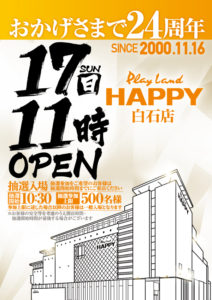 【11/17】DOKO行く?まとめ(ファンカンマルハン) DOKO行く? 2024.11.162024.11.17 マルハン HAPPY 八軒店 東苗穂 二十四軒店 白石店 麻生店 西町店 おわりに 「7」の付く日。マルハンの特定日。対抗はHAPPY店舗といつもの構図……。ファン感ということもありポスター自体が少ないですね……!