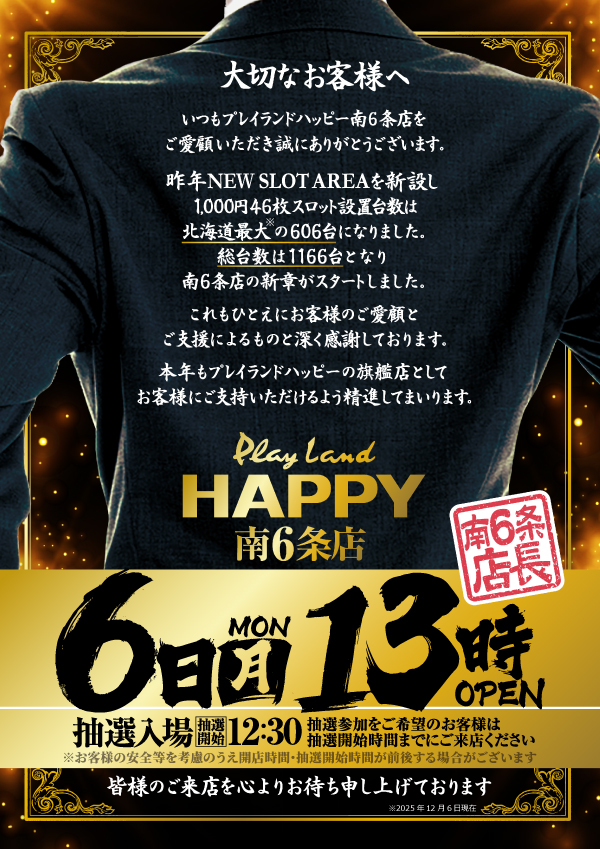 【1/6】DOKO行く?まとめ(連休明けにやる気が漲る) DOKO行く? 2025.01.05 M’s666 EBH HAPPY 南6条店 藻岩店 栄町店 手稲前田、厚別、厚別通、屯田四条、西町、西宮の沢店 ひまわり 月寒×清田店 マルハン おわりに 「6」の付く日。EBH&M’s666の特定日。連休明けの1発目。どうやらやる気が漲っているお店が数店舗……。2025年もHAPPYの勢いは止まらず……!?