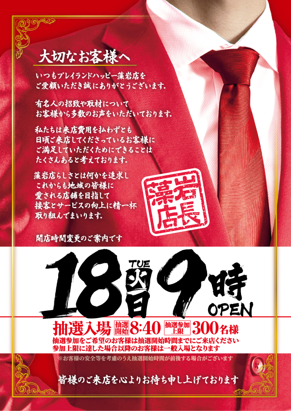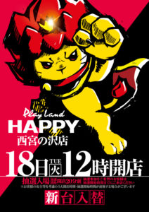 【2/18】DOKO行く?まとめ(HAPPYは中堅も厚い) DOKO行く? 2025.02.17 HAPPY 藻岩店 二十四軒、麻生店 東苗穂、白石、屯田四条店 西町店 八軒店 西宮の沢、厚別、厚別通店 栄町店 イーグル R-1南8条店 ひまわり 真駒内&清田店(射駒たけし来店、スロセレ) マルハン 苗穂店 琴似店 ベガスベガス 大谷地店(戦極 電光石火) おわりに 「8」の付く日。HAPPYの特定日。特定日は高稼働店よりかは中堅クラスのHAPPY店舗が頑張っていますが今回はどうでしょうか……??やはり真駒内ひまわりが来店なので藻岩あたりがバチバチ対抗してくる感じですかね……??