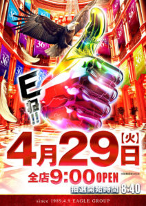 【4/29】DOKO行く?まとめ(小さな巨人) DOKO行く? 2025.04.28 イーグル北郷店(周年) CUBE(周年) イーグル 北41条店 HAPPY 南6条店 麻生店 栄町店 厚別店 厚別通店 西町店 マルハン 苗穂店 アーリーバード藻岩店(トレンドタイム) メガエムズ1(アスカ来店) おわりに 「9」の付く日。イーグルの特定日。周年がイーグル北郷とCUBE。CUBEはわかりませんが、昨年のイーグル北郷はかなり頑張っていたと思います。一応は、「周年×創業×特定日」のアツイ日なんですよね。 小さな巨人に今年も期待……!?