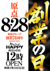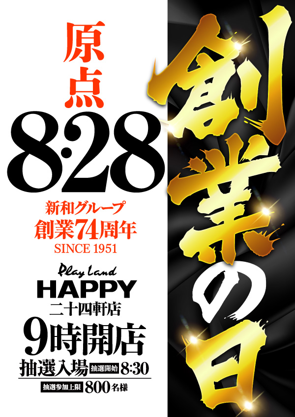 「8」の付く日。HAPPY&ライジングの特定日。8月28日はHAPPYの創業日ということで明日はHAPPYがメインで立ち回ることになると思います……。以外と対抗がないのが困ったところ……。