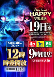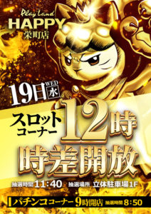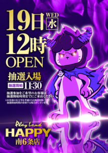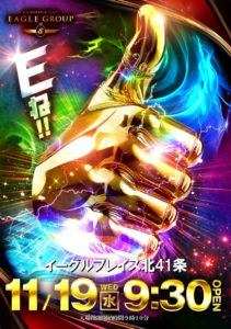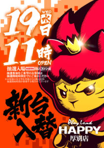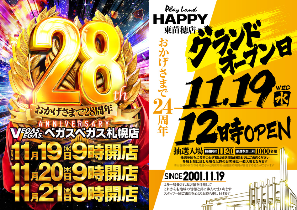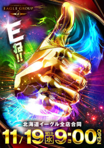 「9」の付く日。イーグルの特定日。周年がHAPPY東苗穂とベガス札幌ということで……。うん……。周年はさすがにHAPPY一択ですね……。他も強そうなポスター出ているので、ベガス札幌が選択肢に入ることは残念ながらなさそうですね……。
