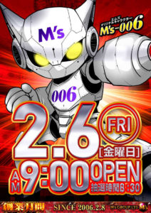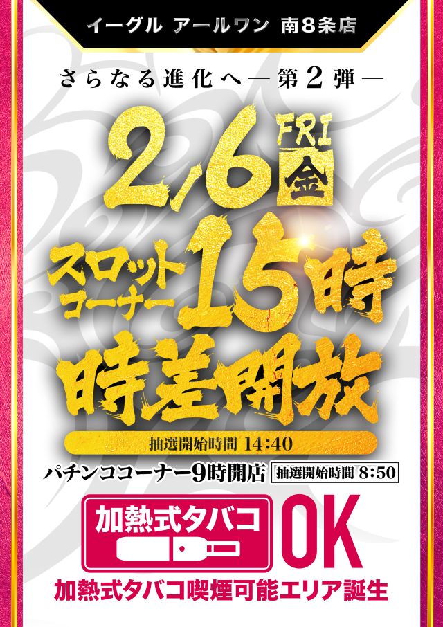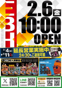 【2/6】DOKO行く?まとめ(加熱式の流れは止まらない?) DOKO行く? 2026.02.05 EBH M’s元町 M’s666 イーグル R-1南8条店 HAPPY 南6条店 麻生店 ひまわり 豊平店(喰種,沖ドキDUO取材) 新琴似店(ジャグ取材) 清田店 マルハン 札幌北店 ライジング 元町店(北斗取材) おわりに 「6」の付く日。EBH&M’s元町&M’s666の特定日。エムズ系列は2月8日の創業日が本命で明日は正直期待はできないかな……と思います。 特日以外だとイーグルR-1が加熱式タバコエリア誕生で20スロ15時、対抗のHAPPY南6条が12時とココ辺りですかね……。